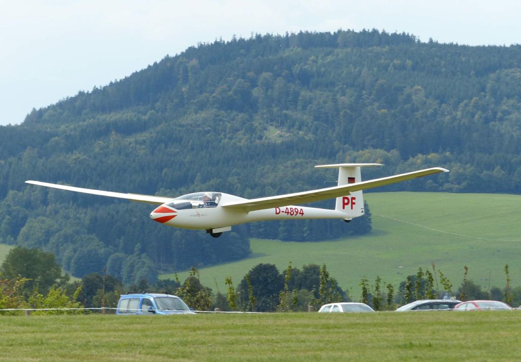 Na přistání jdu od polohy po větru s klapkami +2° a pokud neudělám dlouhý rozpočet, tak se dá vystačit jen s vysunutím horní části brzdících klapek. Ty fungují jako standartní a tak neovlivňují pádovku a dají se zavřít za cenu vystřelení nahoru. Při potřebě strmějšího sestupu se začne při dalším vysunutí klapek současně sklápět i vztlaková klapka a pocit z toho je takový, že při konstatní rychlosti se jen mění úhel sestupu. Klapky vysunuté naplno snižují oproti klasice pádovou rychlost a tak se píše, že při jejich velkém a náhlém přivření dojde k výraznému prosednutí. Toto jsem ale ještě nezaznamenal. Asi je potřeba být blízko pádovce, což na sestupu stejně není moc dobrý nápad. Ještě je potřeba říci, že jakmile se otevřou brzdy, tak se automaticky zablokuje ovladač klapek a není možné místo po brzdách šáhnout na klapky a měnit jejich nastavení (což vedlo také k několika nehodám konkurenčních letadel). Přitom ale maximální otevření brzd není omezené a tak i na špatném nastavení klapek se dá přistát na plné brzdy a ve stejné konfiguraci klapek jako na +2°. Výběh je standartní, křídla nejsou až tak nízko jako u ASW19, podvozek je vyšší, ale zase křídla pruží dolů. Jen ta kolová brzda trochu otravuje život. Dá celkem práci se naučit patami tlačit správným směrem a ještě špičkami ovládat směrovku.